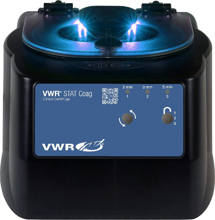 Max. Capacity: 12×100 mm (up to 10 ml) tubes, Max. Speed: 6600 rpm, VWR STAT clinical benchtop centrifuges spin samples in 5 minutes or less for the most urgent chemistry and haematology testing., Optimise for PPP with the VWR® STAT Coag Clinical Centrifuge. Designed with platelet poor plasma spins in mind, the VWR® STAT Coag offers three convenient presets for common laboratory needs. Its fixed angle rotor spins up to 12×100 mm/10 ml tubes at a time. With a compact footprint and simple two-button controls, the VWR® STAT Coag is right at home in accessioning, or for tube processing in the emergency department. Max speed 4400×g/6600 min⁻¹ (rpm)., 02_BulletPoint: 3 convenient presets for common STAT cycles, select using simple two-button interface | LED lid lighting system indicates cycle status: Off when ready, on when running, flashing when done | Max speed 6600 min⁻¹ (rpm)/4400×g | 12 tube capacity (100 mm /10 ml) | Compact size to be used in an array in accessioning, further driving down TAT | Fixed angle rotor design for optimal sample processing | 2 year warranty, 08_Certifications: CE, MET, UKCA, 11_Delivery: Each centrifuge is supplied ready to run with rotor, tube holders, QR code manual and quick start guide. Microtainer tube adapters must be ordered separately., STAT Coag, set-and-lock STAT centrifuge, with 2 button interface and 3 preset cycles, Rotor type: Fixed angle, Electrical: 95 - 253 VAC, 50/60 Hz, Max. RCF: 4400×g, Dimensions: 30.5×35.6×22.9 cm (12×14×9"), Weight: 5.5 kg (12 lbs.), Cat. No.: 77553-266, Final SAP Desc Link: 4633299, SAP Description Status: Ready, VWR STAT clinical benchtop centrifuges spin samples in 5 minutes or less for the most urgent chemistry and haematology testing., Optimise for PPP with the VWR® STAT Coag Clinical Centrifuge. Designed with platelet poor plasma spins in mind, the VWR® STAT Coag offers three convenient presets for common laboratory needs. Its fixed angle rotor spins up to 12×100 mm/10 ml tubes at a time. With a compact footprint and simple two-button controls, the VWR® STAT Coag is right at home in accessioning, or for tube processing in the emergency department. Max speed 4400×g/6600 min⁻¹ (rpm)., 02_BulletPoint: 3 convenient presets for common STAT cycles, select using simple two-button interface | LED lid lighting system indicates cycle status: Off when ready, on when running, flashing when done | Max speed 6600 min⁻¹ (rpm)/4400×g | 12 tube capacity (100 mm /10 ml) | Compact size to be used in an array in accessioning, further driving down TAT | Fixed angle rotor design for optimal sample processing | 2 year warranty, 08_Certifications: CE, MET, UKCA, 11_Delivery: Each centrifuge is supplied ready to run with rotor, tube holders, QR code manual and quick start guide. Microtainer tube adapters must be ordered separately., Final SAP Desc Link: 4633299, SAP Description Status: Ready