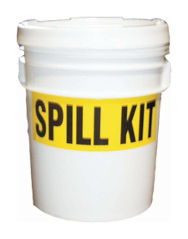 Spill kits include sorbents listed in table plus goggles, gloves, and disposable bag within a plastic drum.