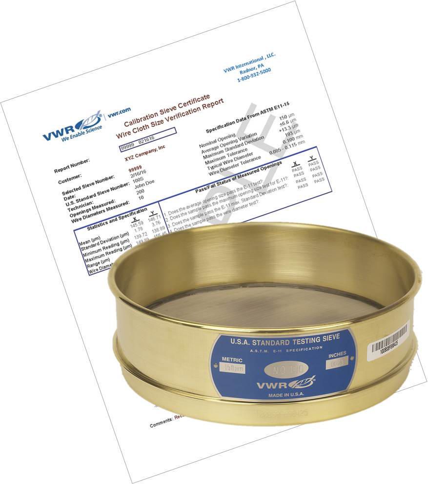 As with other precision lab instruments, periodic re-certification is recommended to ensure the continued conformance and accuracy of working test sieve., Working sieves that are used regularly will eventually suffer wear that may produce inaccurate test results, 04_BodyText: Because accuracy and precision are vital components of any Quality Control Program, VWR® Pre-Certified Sieves ensure compliance with the American Standards Testing Materials (ASTM) E11 specifications., 05_BodyText: VWR® Pre-Certified Sieves employ sophisticated software and optical technology that scans for irregularities and takes physical measurements in a midpoint orientation of the wire in the “X” and “Y” directions (warp and weft). The data gathered is summarized in a comprehensive verification report that is linked to each serialized sieve and evaluates exactly where the sieve lies in relation to the ASTM E11 standards. Verification reports identify a trace number that measurements taken are traceable to the National Institute of Standards and Technology (NIST)., 06_BodyText: The current ASTM E11 standard offers two available grades of pre-certified sieves (inspection or calibration). Inspection Grade sieves are supplied with a Sieve Inspection Certificate containing inspection data that has a percentage of openings and wire dimension measured based on the ASTM E11 standards table providing a confidence level of 99.0% that each sieve is within the specifications. Calibration Grade sieves are supplied with a Sieve Calibration Certificate containing data of at least twice as many apertures measured than inspection sieves, thereby providing the highest confidence level available of 99.73%., 02_BulletPoint: 1" Half height or 2" Full Height | ASTM E11 | Inspection Grade | Certification (99.0% Confidence Level), 08_Certifications: ASTM E11 Calibration certified., 10_Ordering: Serialized Sieves come with Calibration Certification Report., Cat. No.: 10820-238, Mesh size: 850 µm (0.0331"), Usa series: #20, Final SAP Desc Link: 7008581, SAP Description Status: Ready, As with other precision lab instruments, periodic re-certification is recommended to ensure the continued conformance and accuracy of working test sieve., Working sieves that are used regularly will eventually suffer wear that may produce inaccurate test results, 04_BodyText: Because accuracy and precision are vital components of any Quality Control Program, VWR® Pre-Certified Sieves ensure compliance with the American Standards Testing Materials (ASTM) E11 specifications., 05_BodyText: VWR® Pre-Certified Sieves employ sophisticated software and optical technology that scans for irregularities and takes physical measurements in a midpoint orientation of the wire in the “X” and “Y” directions (warp and weft). The data gathered is summarized in a comprehensive verification report that is linked to each serialized sieve and evaluates exactly where the sieve lies in relation to the ASTM E11 standards. Verification reports identify a trace number that measurements taken are traceable to the National Institute of Standards and Technology (NIST)., 06_BodyText: The current ASTM E11 standard offers two available grades of pre-certified sieves (inspection or calibration). Inspection Grade sieves are supplied with a Sieve Inspection Certificate containing inspection data that has a percentage of openings and wire dimension measured based on the ASTM E11 standards table providing a confidence level of 99.0% that each sieve is within the specifications. Calibration Grade sieves are supplied with a Sieve Calibration Certificate containing data of at least twice as many apertures measured than inspection sieves, thereby providing the highest confidence level available of 99.73%., 02_BulletPoint: 1" Half height or 2" Full Height | ASTM E11 | Inspection Grade | Certification (99.0% Confidence Level), 08_Certifications: ASTM E11 Calibration certified., 10_Ordering: Serialized Sieves come with Calibration Certification Report., Cat. No.: 10820-056, Mesh size: 63 µm (0.0025"), Usa series: #230, Final SAP Desc Link: 7008581, SAP Description Status: Ready, As with other precision lab instruments, periodic re-certification is recommended to ensure the continued conformance and accuracy of working test sieve., Working sieves that are used regularly will eventually suffer wear that may produce inaccurate test results, 04_BodyText: Because accuracy and precision are vital components of any Quality Control Program, VWR® Pre-Certified Sieves ensure compliance with the American Standards Testing Materials (ASTM) E11 specifications., 05_BodyText: VWR® Pre-Certified Sieves employ sophisticated software and optical technology that scans for irregularities and takes physical measurements in a midpoint orientation of the wire in the “X” and “Y” directions (warp and weft). The data gathered is summarized in a comprehensive verification report that is linked to each serialized sieve and evaluates exactly where the sieve lies in relation to the ASTM E11 standards. Verification reports identify a trace number that measurements taken are traceable to the National Institute of Standards and Technology (NIST)., 06_BodyText: The current ASTM E11 standard offers two available grades of pre-certified sieves (inspection or calibration). Inspection Grade sieves are supplied with a Sieve Inspection Certificate containing inspection data that has a percentage of openings and wire dimension measured based on the ASTM E11 standards table providing a confidence level of 99.0% that each sieve is within the specifications. Calibration Grade sieves are supplied with a Sieve Calibration Certificate containing data of at least twice as many apertures measured than inspection sieves, thereby providing the highest confidence level available of 99.73%., 02_BulletPoint: 1" Half height or 2" Full Height | ASTM E11 | Inspection Grade | Certification (99.0% Confidence Level), 08_Certific