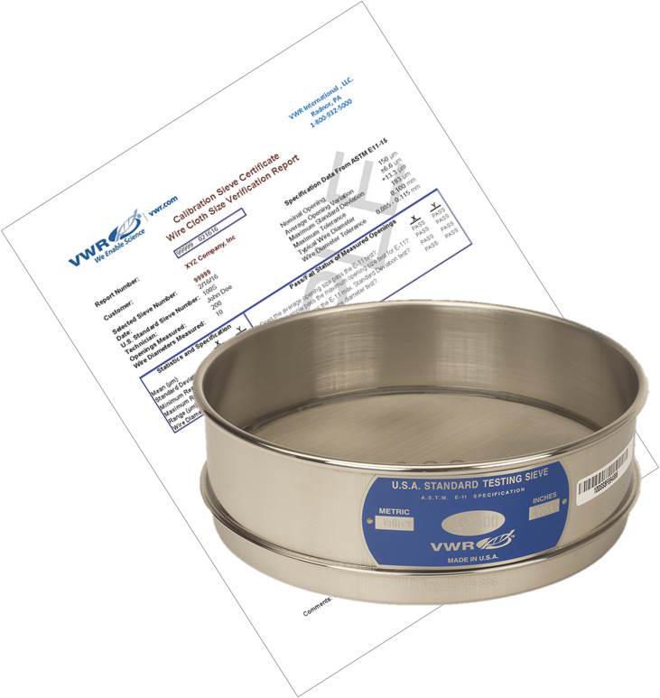 As with other precision lab instruments, periodic re-certification is recommended to ensure the continued conformance and accuracy of working test sieve., Working sieves that are used regularly will eventually suffer wear that may produce inaccurate test results, 04_BodyText: The current ASTM E11 standard offers two available grades of pre-certified sieves (inspection or calibration). Inspection Grade sieves are supplied with a Sieve Inspection Certificate containing inspection data that has a percentage of openings and wire dimension measured based on the ASTM E11 standards table providing a confidence level of 99.0% that each sieve is within the specifications. Calibration Grade sieves are supplied with a Sieve Calibration Certificate containing data of at least twice as many apertures measured than inspection sieves, thereby providing the highest confidence level available of 99.73%., 05_BodyText: Because accuracy and precision are vital components of any Quality Control Program, VWR® Pre-Certified Sieves ensure compliance with the American Standards Testing Materials (ASTM) E11 specifications., 06_BodyText: VWR® Pre-Certified Sieves employ sophisticated software and optical technology that scans for irregularities and takes physical measurements in a midpoint orientation of the wire in the “X” and “Y” directions (warp and weft). The data gathered is summarized in a comprehensive verification report that is linked to each serialized sieve and evaluates exactly where the sieve lies in relation to the ASTM E11 standards. Verification reports identify a trace number that measurements taken are traceable to the National Institute of Standards and Technology (NIST)., 02_BulletPoint: 1" Half height or 2" Full Height | ASTM E11 | Inspection Grade | Certification (99.0% Confidence Level), 08_Certifications: ASTM E11 Calibration certified., 10_Ordering: Serialized Sieves come with Calibration Certification Report., Cat. No.: 10820-108, Mesh size: 75 µm (0.0029"), Usa series: #200, Final SAP Desc Link: 7008581, SAP Description Status: Ready, As with other precision lab instruments, periodic re-certification is recommended to ensure the continued conformance and accuracy of working test sieve., Working sieves that are used regularly will eventually suffer wear that may produce inaccurate test results, 04_BodyText: The current ASTM E11 standard offers two available grades of pre-certified sieves (inspection or calibration). Inspection Grade sieves are supplied with a Sieve Inspection Certificate containing inspection data that has a percentage of openings and wire dimension measured based on the ASTM E11 standards table providing a confidence level of 99.0% that each sieve is within the specifications. Calibration Grade sieves are supplied with a Sieve Calibration Certificate containing data of at least twice as many apertures measured than inspection sieves, thereby providing the highest confidence level available of 99.73%., 05_BodyText: Because accuracy and precision are vital components of any Quality Control Program, VWR® Pre-Certified Sieves ensure compliance with the American Standards Testing Materials (ASTM) E11 specifications., 06_BodyText: VWR® Pre-Certified Sieves employ sophisticated software and optical technology that scans for irregularities and takes physical measurements in a midpoint orientation of the wire in the “X” and “Y” directions (warp and weft). The data gathered is summarized in a comprehensive verification report that is linked to each serialized sieve and evaluates exactly where the sieve lies in relation to the ASTM E11 standards. Verification reports identify a trace number that measurements taken are traceable to the National Institute of Standards and Technology (NIST)., 02_BulletPoint: 1" Half height or 2" Full Height | ASTM E11 | Inspection Grade | Certification (99.0% Confidence Level), 08_Certifications: ASTM E11 Calibration certified., 10_Ordering: Serialized Sieves come with Calibration Certification Report., Cat. No.: 10820-306, Mesh size: 125 µm (0.0049"), Usa series: #120, Final SAP Desc Link: 7008581, SAP Description Status: Ready, As with other precision lab instruments, periodic re-certification is recommended to ensure the continued conformance and accuracy of working test sieve., Working sieves that are used regularly will eventually suffer wear that may produce inaccurate test results, 04_BodyText: The current ASTM E11 standard offers two available grades of pre-certified sieves (inspection or calibration). Inspection Grade sieves are supplied with a Sieve Inspection Certificate containing inspection data that has a percentage of openings and wire dimension measured based on the ASTM E11 standards table providing a confidence level of 99.0% that each sieve is within the specifications. Calibration Grade sieves are supplied with a Sieve Calibration Certificate containing data of at least twice as many apertures measured than inspection sieves, thereby providing the highest confidence level available of 99.73%., 05_BodyText: Because accuracy and precision are vital components of any Quality Control Program, VWR® Pre-Certified Sieves ensure compliance with the American Standards Testing Materials (ASTM) E11 specifications., 06_BodyText: VWR® Pre-Certified Sieves employ sophisticated software and optical technology that scans for irregularities and takes physical measurements in a midpoint orientation of the wire in the “X” and “Y” directions (warp and weft). The data gathered is summarized in a comprehensive verification report that is linked to each serialized sieve and evaluates exactly where the sieve lies in relation to the ASTM E11 standards. Verification reports identify a trace number that measurements taken are traceable to the National Institute of Standards and Technology (NIST)., 02_BulletPoint: 1" Half height or 2" Full Height | ASTM E11 | Inspection Grade | Certification (99.0% Confidence Level), 08_Certifi