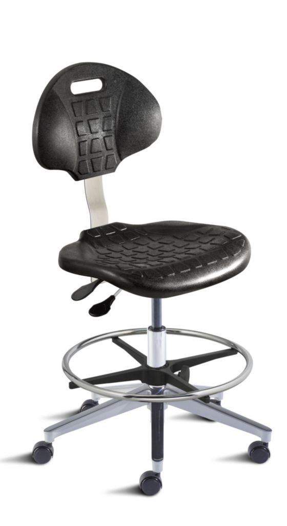 Chair Chrome Finish^ Chair, Black Urethane, Chrome Finish, High Bench Height, 26In Diameter Cast Aluminum Base, 20In Diameter Adjust Footring, Dual Wheel Casters Resist Movement Seat Height Adjust: 21-31In, Seat: 18.5In W X 17In D X 1.5In, Backrest: 16.5In W X 12.5In H With Lumbar Support