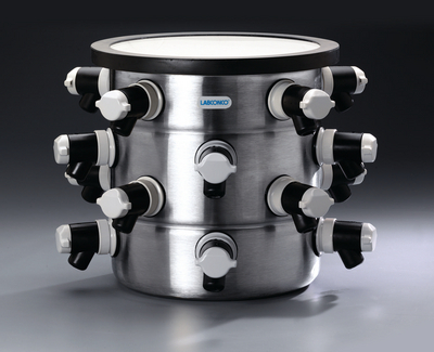 Drying Chamber 16-Port 33 x 33 cm^ Drying Chambe, 16-Port With PTFE, Material: Stainless steel, Corrosion-resistant PTFE-coated interior, Includes 16 neoprene valves that accommodate both 1/2in and 3/4in adapters, For freeze dry system, Dimension: 33 x 33 cm