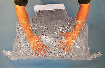 Spilfyter* HANDS-IN-BAG* Atmospheric Chamber^ Portable glove box alternative. Large bag with 4 hand inlets for handling of sensitive/hazardous materials. High-clarity polyethylene film can be sealed, purged, inflated with inert gas. Sealing device included. Uninflated: 147x130cm. Gas volume: 495L.