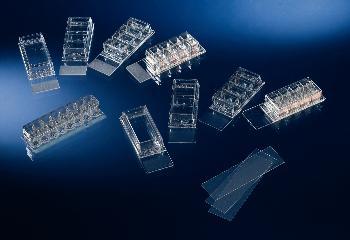 Nunc Lab-Tek Chamber Slide System, Thermo Scientific^ Slide is made of glass and the suggested working volume is 2.5 -4.5 ml this chamber system fits most standard equipment