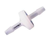 1/4 Inch Check Valve^ Tubing barbed check valves are constructed of chemical-resistant Kynar body and Viton valve for an inert high purity smooth and clear flow path. Operating range: 0-50 PSI and -40 to 126 degrees Celsuis. Autoclavable. 1-1/4 inch length. Installs in any position.
