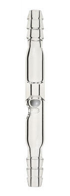 VALVE, CHECK^ Similar to CG-4518, but having serrated hose connections on either end to accept flexible tubing. Tubing O.D. is 10mm while the overall length is approx. 100mm. Hose connection O.D. is 9mm at the middle ring.