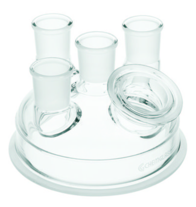 Reaction Vessel Lid; 5-Neck; Flange I.D: 200mm; Center Neck: 45/50; Side Necks: 24/40 (3), 60mm Schott o-ring flange(1); Fits 200mm flanged reaction vessels; Contains flat ground surface allowing it to be greased or used with an o-ring