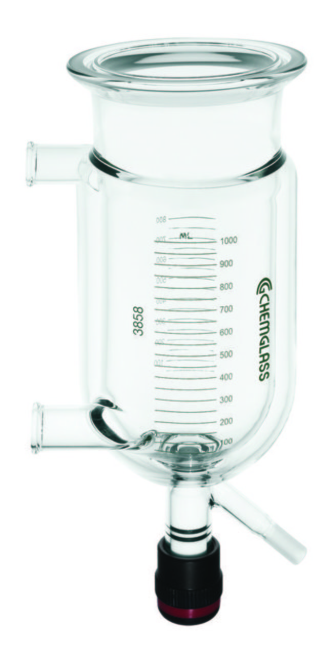 Reaction Vessel; Cylindrical; Jacketed; Benchtop; 3000mL; Schott O-Ring Flange I.D 150mm; Inlet/Outlet 3/4 in. Beaded Pipe; Graduation scale on both sides; Constructed w/flange having a groove formed in the sealing surface of the flange
