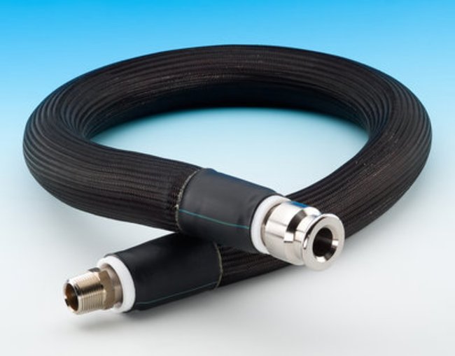 Hose; Chemglass; NPT male to beaded pipe; Triple insulated; Temperature range -80 to 250 deg.C; One end has beaded pipe fitting and the other is a 0.75 in. male NPT; 4 ft.. Length; 1 in. beaded pipe