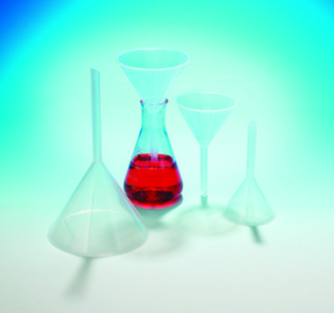 Funnel, Standard Stem; Chemglass; Capacity: 59.1mL; Top ID: 65mm; Polypropylene; External ribs prevent airlock; Parallel stem measures 8mm OD; Steam autoclavable at 121 deg.C (250 deg.F)