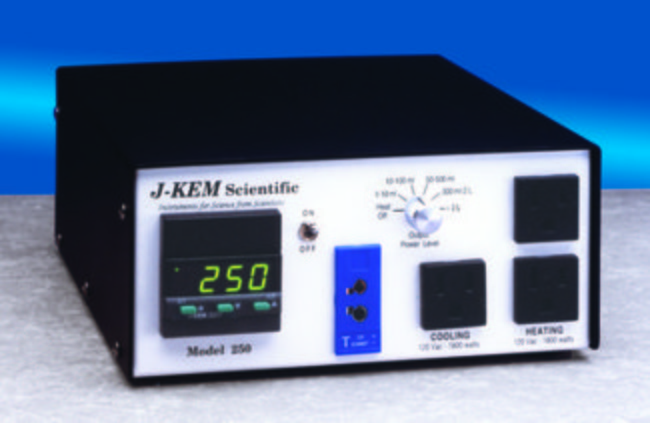 Controller, Temperature; Chemglass; J-Kem; Model 250; With 3 power outlets for maximum versatility; H x W x D 3.25 x 7.5 x 9 in.; Type T (-200 deg.C to 250 deg.C); Complete