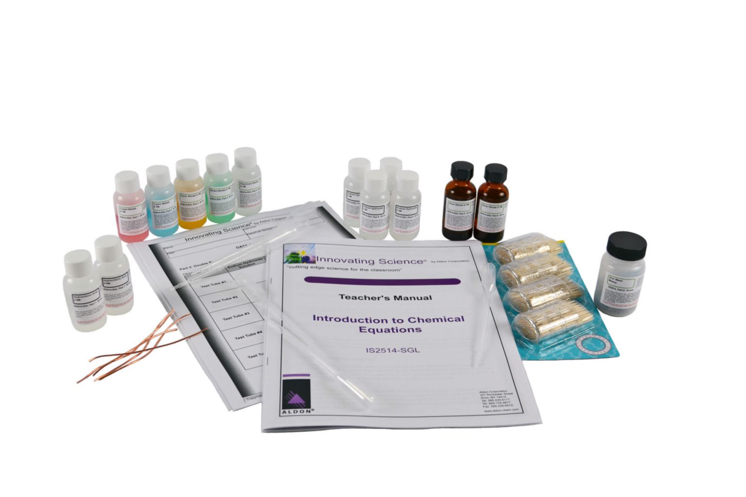 Introduction To Chemical Equations Kit^ Introduction To Chemical Equations Kit, Includes: Cobalt Nitrate, Cupric Nitrate, Ferric Nitrate, Nickel Nitrate, Aluminum Nitrate, Sodium Hydroxide, Silver Nitrate, Graduated Pipettes, Zinc Metal Pieces, To Identify Single And Double Replacement Reactio