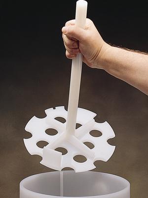 Churn Sample Splitter^ Polyethylene; consists of thick-walled cylindrical vessel with disc churn. Small polypropylene spring-loaded spigot drains subsamples into bottles for delivery. Swing type handle. Lid and spigot are replaceable. Size: 4L. Diameter: 17cm. Height: 30cm; 44cm (with handle up).