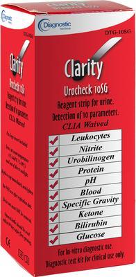 Clarity 10SG Urine Strip^ Urinalysis strip test for Leukocytes, Nitrite, Urobilingen, Protein, pH, Blood, Specific Gravity, Ketones, Bilirubin and Glucose. Visual or automated read on Clarity 120 Reader. 100 tests per bottle. CLIA Waived. DTG-10SG