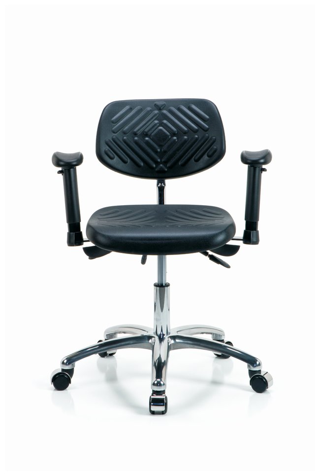 Class 100 Polyurethane Clean Room Chair - Desk Height with Adjustable Arms and Casters in Black Polyurethane, Each