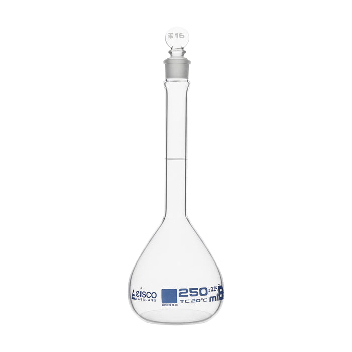 Class B Glass Volumetric Flask with Glass Stopper, Class B Glass Volumetric Flask with Glass Stopper features a single graduation and blue markings., Each