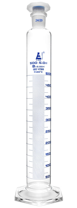 Measuring Cylinder, fitted with an interchangeable 24/23 polypropylene stopper. Class B. Made of high quality borosilicate glass. 500ml capacity, 5ml graduation lines, marked every 50ml. Blue graduations. Stands 15.5" tall, and has a base measuring 4". This cylinder has a hexagonal base for stability.