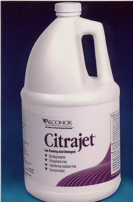 Citrajet* Low-Foaming Liquid Acid Cleaner^ 3.78L. For use as acid wash or rinse. Phosphate-free, biodegradable. Removes metal oxides, salts, and inorganic residues. Suitable for use in federally inspected meat and poultry plants. Cleans laboratory equipment and apparatus.