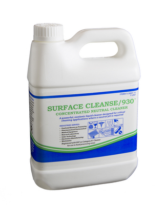 Surface-Cleanse/930* Concentrated Neutral Cleaner^ 20L container. Non-ionic. Neutral pH of 7.0 and low conductivity. For manual washing operations, ultrasonic baths, mild agitation systems. Removes greases, oils, and other soils. No CFCs, ODCs, phosphates, borates, halogens, silicates, or phenols.