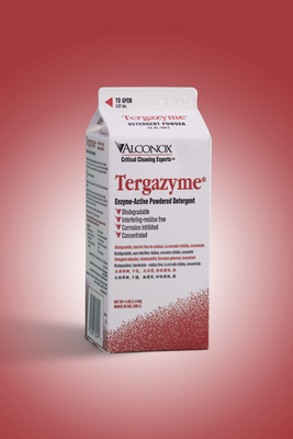 Tergazyme* Enzyme-Action Powder Detergent^ 1.8kg powdered enzyme detergent removes proteinaceous soils, tissue, blood and body fluids from glass, metal, stainless steel, porcelain, ceramic, plastic, rubber, and fiberglass. Biodegradable and noncorrosive. Dilute 1:100.