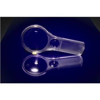 Clear plastic magnifier is 110mm (4.50 ") in length and features dual lenses of 3x and 6x magnification. 3x lens is 50mm in diameter and 6x lens is 20mm in diameter.Handy molded plastic magnifier has 2x, 6x, and 8x magnification lenses.