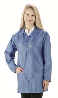EconoShield* ECX-500 Lab Coat^ Conductive, non-flaking, and non-sloughing. Static decay rate of fabric is 5000V to 500V in less than 0.1 seconds, providing excellent static shielding. Mid-thigh length, with a lapel collar and three pockets. Color: blue. Size: X-Small.