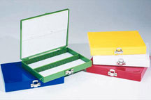 Store and transport 100 slides safely with durable ABS cases. Fisherbrand™ Colored ABS 100 Place Slide Boxes keep standard microscope slides in numbered, grooved slots. Provides safe, dust-free storage.