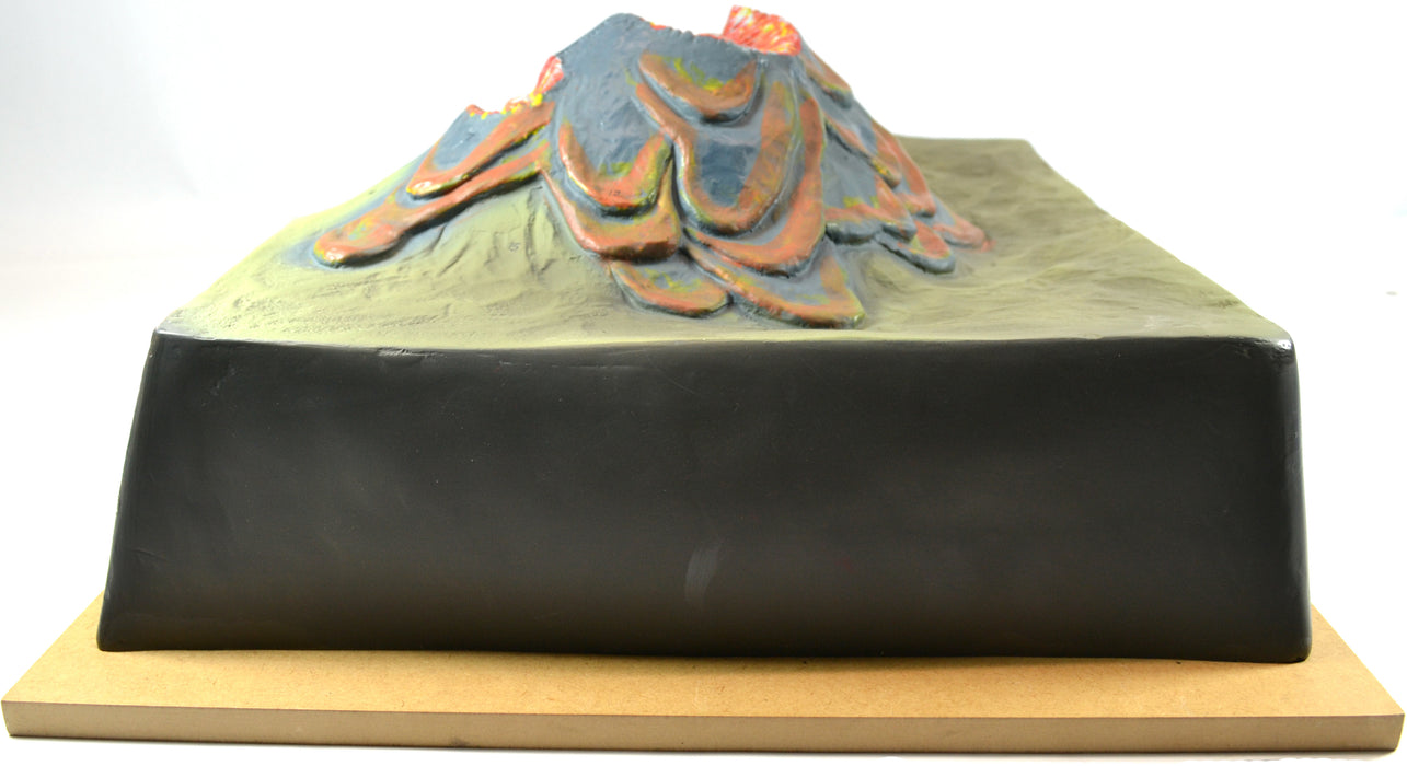Table top model of an active volcano is cut away to show the internal structures. Includes the magma chamber, vent, side vents, sills, and crater, as well as rock layers and surrounding terrain. Mounted onto base. Numbered with included key card for easy identification of features. Crafted by subject matter experts - Features vibrant, hand-painted details using eco-friendly paint. Designed as a visual learning aid for introducing volcanoes, volcanology, and the effects of a volcano on the Earth.Measures 17" x 16" x 7".