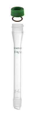 DISTILLING COLUMN, HEMPLE, MINUM-WARE^ Hemple style column with indents just above the lower inner joint to support packing material. Top threaded outer joint and lower inner drip tip joint are 14/10. Supplied complete with open-top screw cap (MW-102-33) and Viton O-ring (MW-100-08).