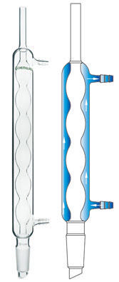 CONDENSER, ALLIHN^ Jacket Length: 120mm; Overall Height: 175mm. Joint size: 14/20. Allihn style reflux condenser with a plain tubulation at the top and a lower inner drip tip joint. Hose connections have an O.D. of 10mm at the middle serration.