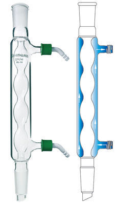 Condenser, Allihn, 24/40 Joint Size, 300mm Jacket Length, Removable Hose Connection^ Connections are made of polypropylene and provide a safe and easy way of connecting and disconnecting flexible tubing. Hose connections have O.D. of 8mm and I.D. of 4mm. Includes 2 open-top screw caps