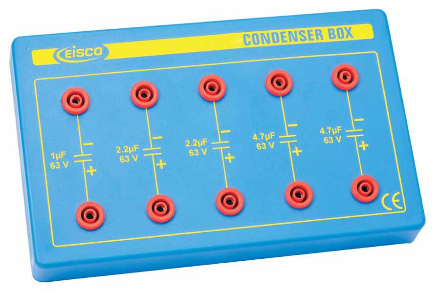 Condenser Box^ Condenser Box, provides differentvalues of Electrolytic capacitors ranging from 1ufd to 4.7ufd, /- 10% tolerance and, of 63 volts working voltage, Built on 8in x 5in Plastic Box
