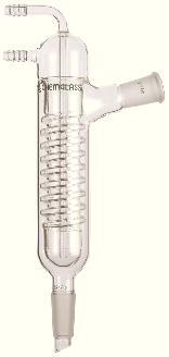 Condenser, Friedrichs^ Specially formed spiral inner tube providing long vapor path for good heat transfer and anti-flooding characteristics. Standard taper outer joint at 15[degree] angle to condenser; lower inner drip tip joint. 10mm hose connection O.D. at middle serration. Joint size: 24/40.