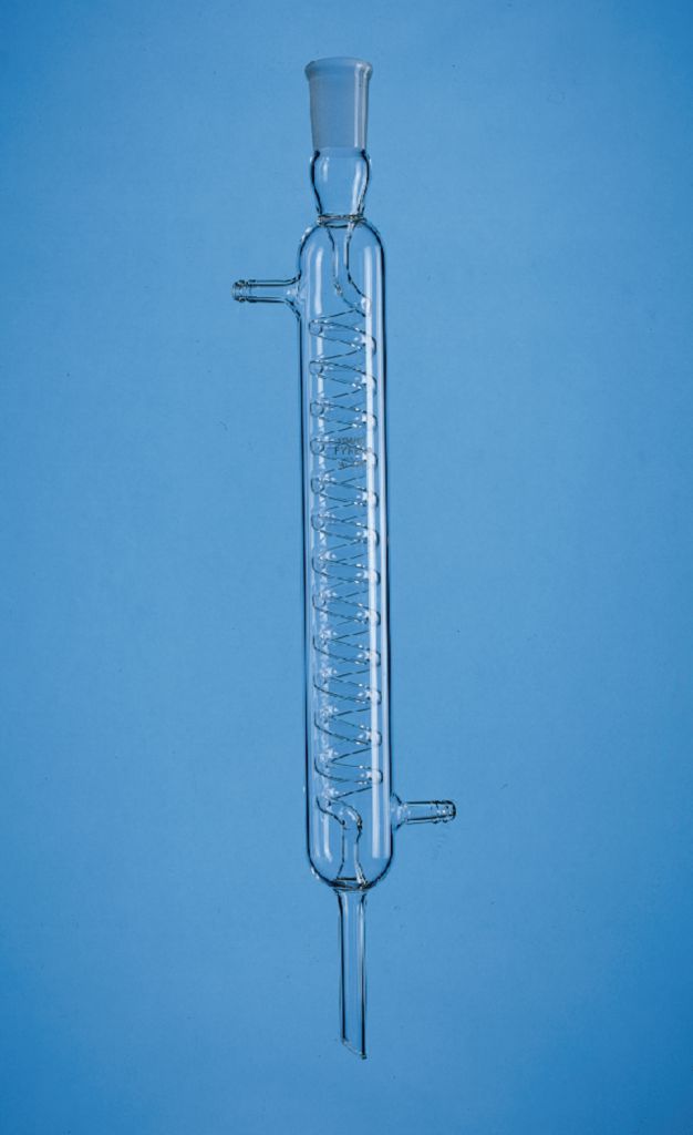 LABGLASS brand, Graham, Outer [standard taper] Joint, Condensers^ 19/38. 350 mm. 41x 200 mm. Condensor has a high surface of area per unit length of jacket. Primarily used in distillation assemblies. With the outer [standard taper] joint at the top. The tubulation O.D. is approximately 10 mm.