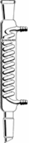 Condenser, Reflux^ With double wall thimble-shaped bulb sealed into outer jacket. Serrated hose connections for water extend through outer bulb. 10mm O.D. in middle serration. Overall height: 210mm. As efficient as a standard 400mm Liebig or West condenser. Standard taper joint size: 24/40.