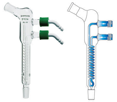 Condenser, Reflux, 14/20 Joint Size, 100mm Jacket Length, Removable Hose Connections^ Connections are made of polypropylene and provide a safe and easy way of connecting and disconnecting flexible tubing. Hose connections have O.D. of 8mm and I.D. of 4mm. Includes 2 open top screw caps