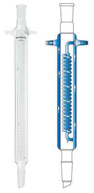CONDENSER, REFLUX^ Jacket Length: 250mm; Overall Height: 390mm. Joint size: 24/40. Similar to CG-1215 but with the top tubulation replaced with a standard taper outer joint. Hose connections have an O.D. of 10mm at the middle serration.