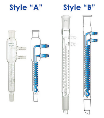 CONDENSER, REFLUX^ Jacket Length: 300mm; Overall Height: 465mm. Joint size: 24/40. Coil style reflux condenser with tightly wrapped coil providing maximum cooling. Excellent for use with high vapor pressure solvents. Condenser has a top outer standard taper joint and lower inner drip tip joint.