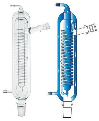 CONDENSER, HIGH EFFICIENCY^ Jacket Length: 400mm; Overall Height: 500mm. Joint size: Lower: 24/40. This unique design combines some of the best features for refluxing in a single condenser. Coolant, introduced into the upper hose connection, fills a large cold finger that is wrapped with coils.