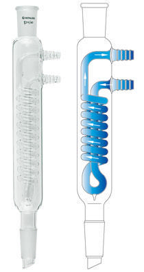 CONDENSER, REFLUX^ Coil Length: 175mm; Overall Height: 350mm. Joint size: 24/40. Similar to CG-1213, but having a larger diameter jacket and coil, thereby providing maximum cooling capacity while being shorter in length. Jacket has a O.D. of 41mm while the coil O.D. is 8mm.