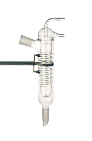 Friedrich condenser specially designed to provide a long vapor path, good heat transfer and anti-flooding characteristics. Molded inner spiral provides surface area for the condensation of the product, Inclined Standard Taper outer joint on the side , Water inlet and outlet located above ring-sealed inner condensing tube, Standard Taper inner drip joint at the bottom