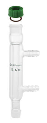 CONDENSER, JACKETED REFLUX, MINUM-WARE^ Liebig-type water jacketed condenser with a jacket length of 80mm. With top threaded outer and lower inner drip joint, both 14/10. Supplied complete with open-top screw cap (MW-102-33) and Viton O-ring (MW-100-08).