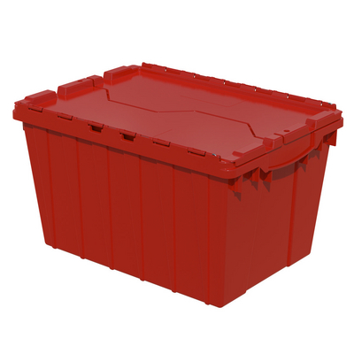 Attached Lid Container 12 gallon^ Attached Lid Container, Mateial: Plastic, Color: Red, Feaures: Reusable, Protect contents from dust or damage, Textured bottoms provide a sure grip on conveyor belt, Easy lifting and carrying, Dimension: 21-1/2 x 15 x 12-1/2 in, Size: 12 gallon