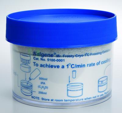 Nalgene Cryo 1C in Mr. Frostyin Freezing Container, Thermo Scientific^ Polycarbonate containers with blue-high-density polyethylene closure, screw top lid secures samples inside in the event of accidental container tipping, eliminates unreliable improvised foam container devices.