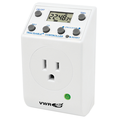 Here is the corrected text: This versatile and economical controller can program equipment to turn on and off at any minute of any day. Its fail-safe memory allows programming of 14 different switchings per day. The 1.3 cm (¹/₂") LCD display shows the time of day, day of the week, and event number of the program in progress. A manual override button permits equipment to be switched on or off independently of event settings. Program and clock times are maintained by a backup battery in the event of an electrical outage. The controller can allocate up to 196 switchings per week over four separate weekly programs. It can turn equipment on and off in intervals as short as 1 minute or as long as 168 hours. The a.m./p.m. day programs allow repeating the same cycle every day of the week, weekdays only, weekends only, or any selected days. This product features a Traceable certification, high-impact ABS plastic case, and a motor load capacity of 1 hp. A serial-numbered certificate is provided from an ISO 17025 calibration laboratory accredited by A2LA to indicate instrument traceability to standards provided by the National Institute of Standards and Technology. The controller includes two 1.5 V batteries and operating instructions. Its dimensions are 8.9 × 10.2 × 5.1 cm (3½ × 4 × 2"), and it operates on 125 V, 50/60 Hz, 15 A, 1850 W power with an accuracy of 0.01%.