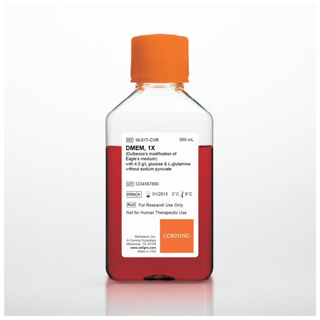 Substitution of Pyridoxine HCl for Pyridoxal ensures improved stability over original formulation. Corning™ DMEM with L-Glutamine, 4.5 g/L Glucose and Sodium Pyruvate is hybridoma tested.