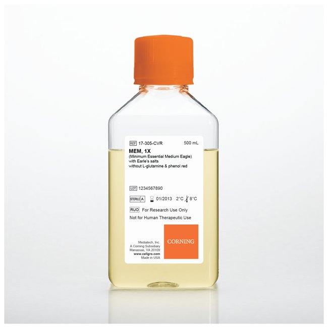 Minimum Essential Medium (MEM) is a common cell culture medium developed from early work using Basal Medium Eagle (BME) with normal mammalian fibroblasts and certain subtypes of HeLa cells. This research indicated that additions made to BME aided cell propagation. MEM is modified with higher concentrations of amino acids to more closely approximate the protein composition of mammalian cells. When supplemented with serum, MEM has been used for cultivation of a wide variety of cells grown in monolayer, such as fibroblast. This formulation contains sodium bicarbonate and does not contain L-glutamine.This product(s) resides on a Fisher Scientific GSA or VA contract. If you are viewing this page as a nonregistered user, the price(s) displayed is List Price. To view your GSA or VA contract pricing, log in using your account number, or become a registered user by contacting one of our Customer Service teams. You can also view your contract price by searching for this item(s) on GSA Advantage. To place an order, contact Fisher Scientific Customer Service.