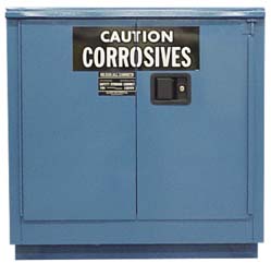 Corrosive/Acid Storage Cabinet^ Has adjustable shelf and leveling legs, 3-point latching, 5.1cm vents with flash arrestors, flush-mount locking handle, 5.1cm leakproof sill. Made with 18-gauge, galvanized steel with double wall and 3.8cm air space. Do not store nitric or sulfuric acid. Blue. 90.8L.