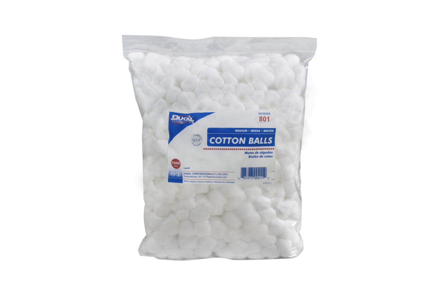 Dukal Cotton Balls are made of 100% bleached cotton and are absorbent and clean^ They are soft and uniform in size.
