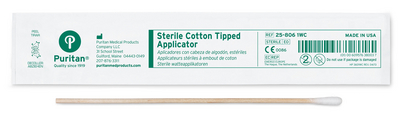 Sterile Cotton-Tipped Applicators^ Sterile, disposable, cotton-tipped wood applicators are manufactured from long, straight-grained white birch veneers. Individually wrapped in a peel-open package. 15cm long. 0.21cm in diameter.